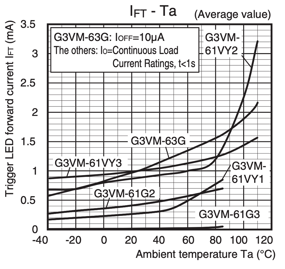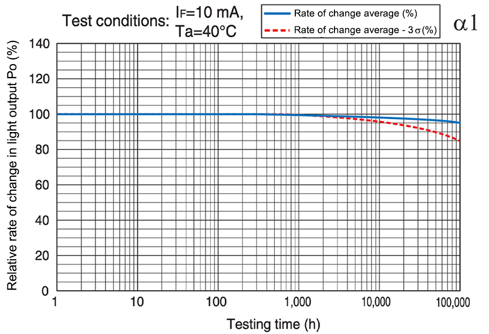 LEDs gradually degrade over time. The higher the input-side current, the faster the degradation rate, so the input-side current value should be designed with this in mind. In addition, the type of LEDs mounted on each MOS FET relay product differs, and at the same time, the aging degradation rate also differs. We have published information on LEDs, so please use this information as a basis for your design.