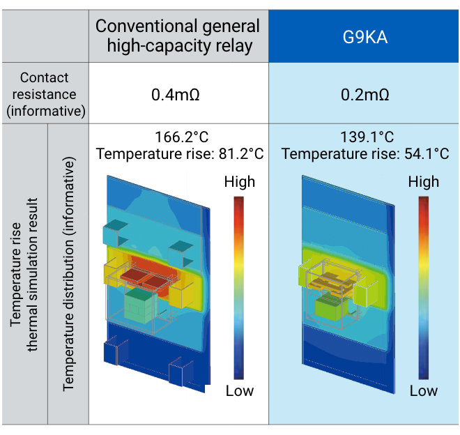 The G9KA high-capacity power relay was developed to solve this heat generation problem. G9KA's industry-leading* ultra-low contact resistance of 0.2 mΩ max suppresses heat generation, a major challenge in downsizing and high capacity.