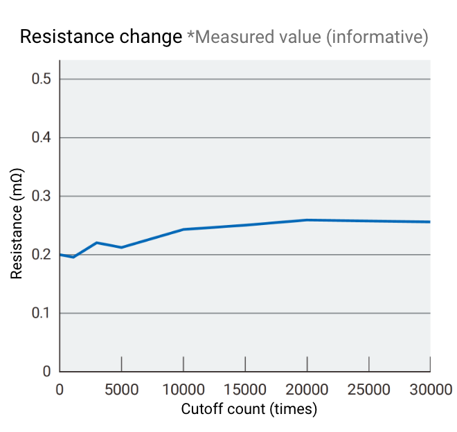 As a result, the temperature rise can be reduced by about 30% compared to relays with comparable general performance. Furthermore, it maintains stable contact resistance (reference value) in switching durability evaluation, and contributes to heat generation issues with significantly lower contact resistance compared to conventional relays with equivalent performance.