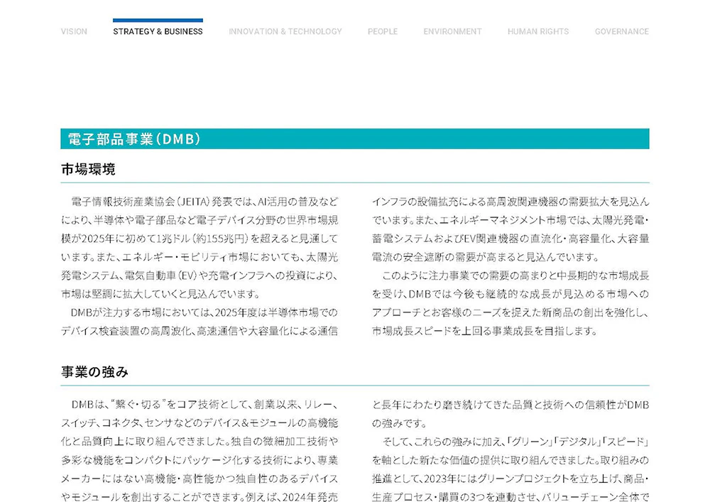 ![DMSグローバル 2025年3月末時点[Basic data]グループ社員数(有期雇用含む)7.6千人、グローバル人材(海外:国内従業員比率)7:3、生産拠点11拠点、1年間で製造した数量20億個、売上高(第3者売上)1054億円、海外売上比率73%、保有特許数2800+、電子部品Webサイトアクセス数250万PV[Sustainability*]GHG排出量35Kt-CO2、FY21比-36Kt、電力使用量115GWhFY21比-29GWh、取水量481k㎥FY21比-80k㎥、自社発電量(PPAオンサイト含む)3801MWh962世帯相当**](/sites/default/files/2025-09/omron_figure05-jp_v2.webp)