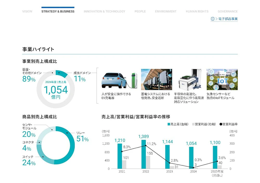 *1 リレー、スイッチ、コネクタ、センサなどのデバイス&モジュールの高機能化と、製品に流れる電気を繋ぐ・切る(オン・オフする)機能やセンシングする機能のこと。詳細はこちらをご覧ください。