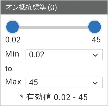項目内の選択肢が多いMOS FETリレーも、負荷電圧(V)や連続負荷電流(mA)など範囲設定できるパラメータで対応。