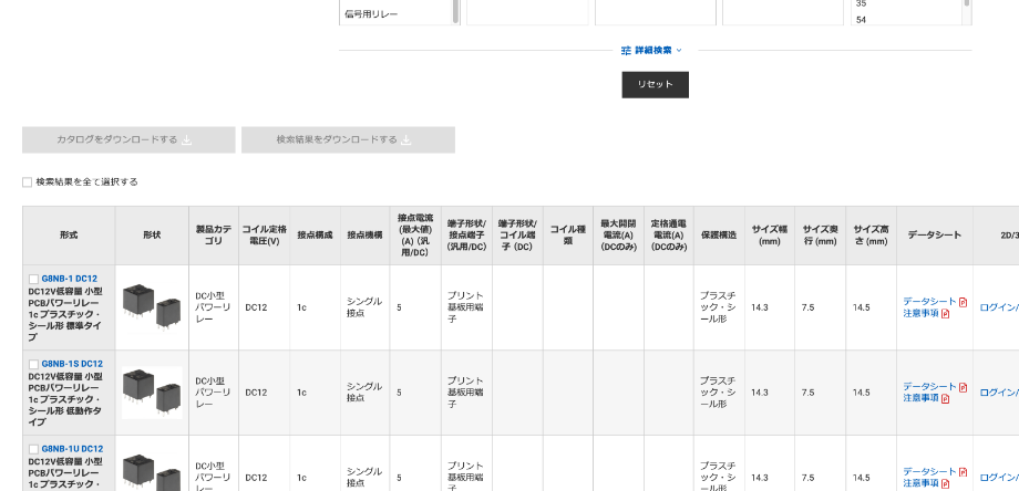 例えば、リレーを選定する場合、リレーの「定格電流」「定格電圧」「コイル定格」「接点構成」を選んで機種を絞り込みます。