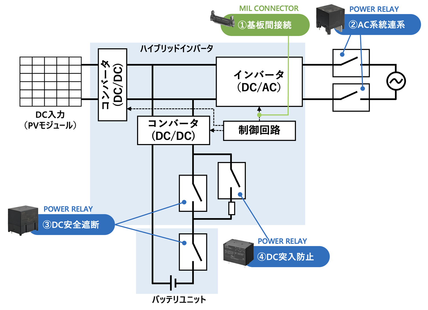 蓄電システム向けアプリケーションに推奨するオムロンの電子部品 (リレー、スイッチ、 コネクタ、 センサ) を紹介いたします。