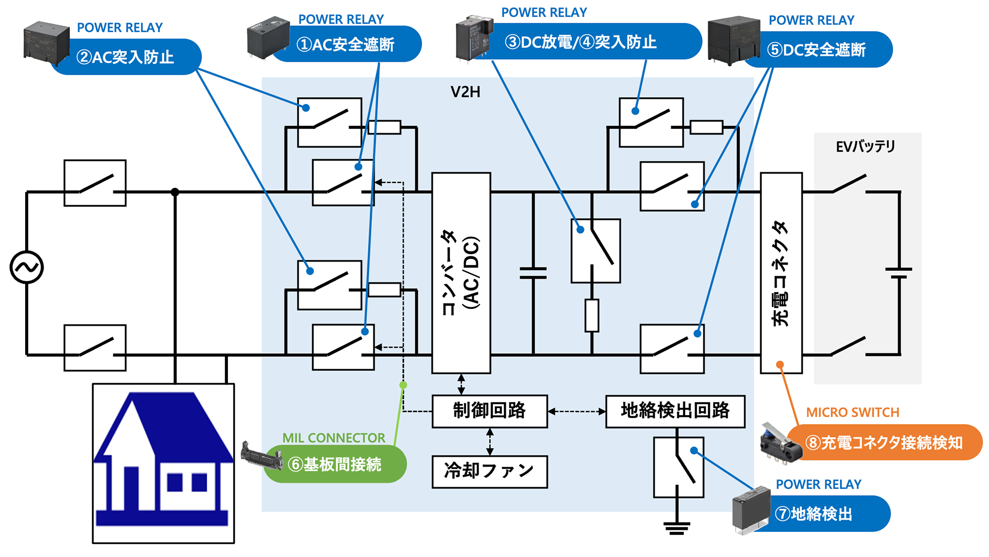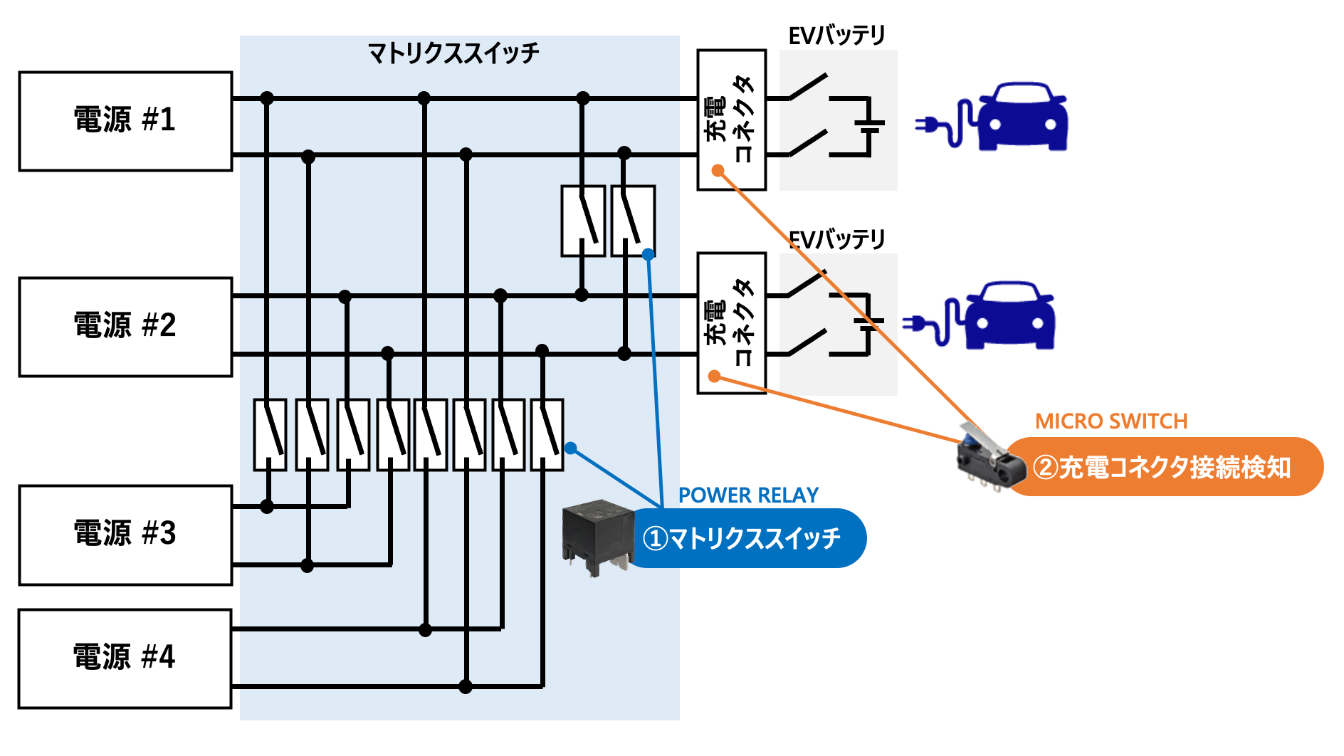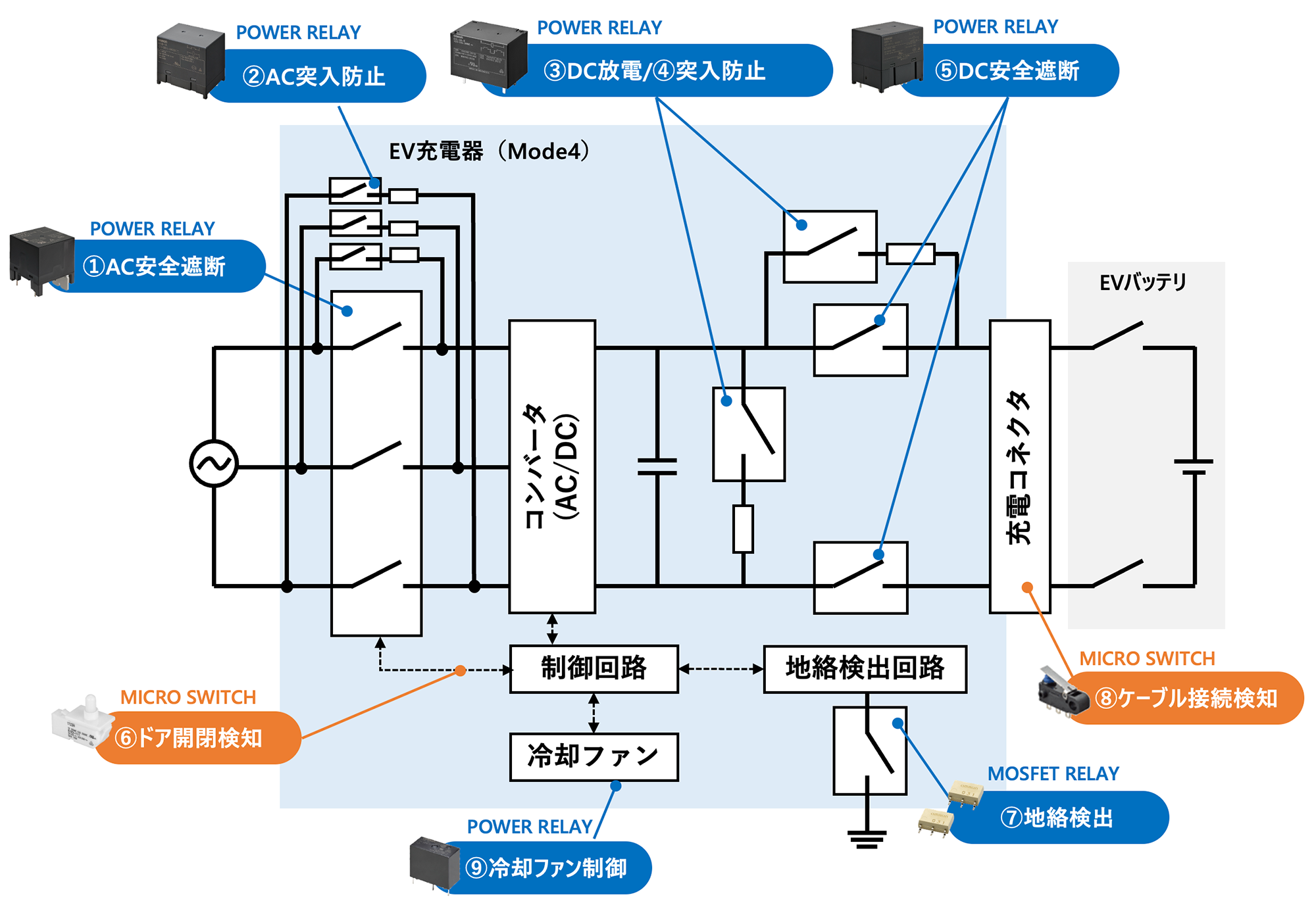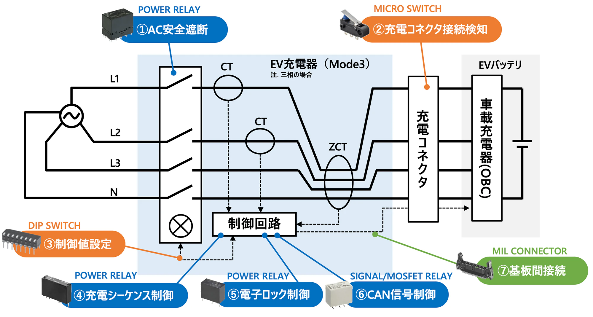 EV充電器向けアプリケーションに推奨するオムロンの電子部品 (リレー、スイッチ、 コネクタ、 センサ) を紹介いたします。