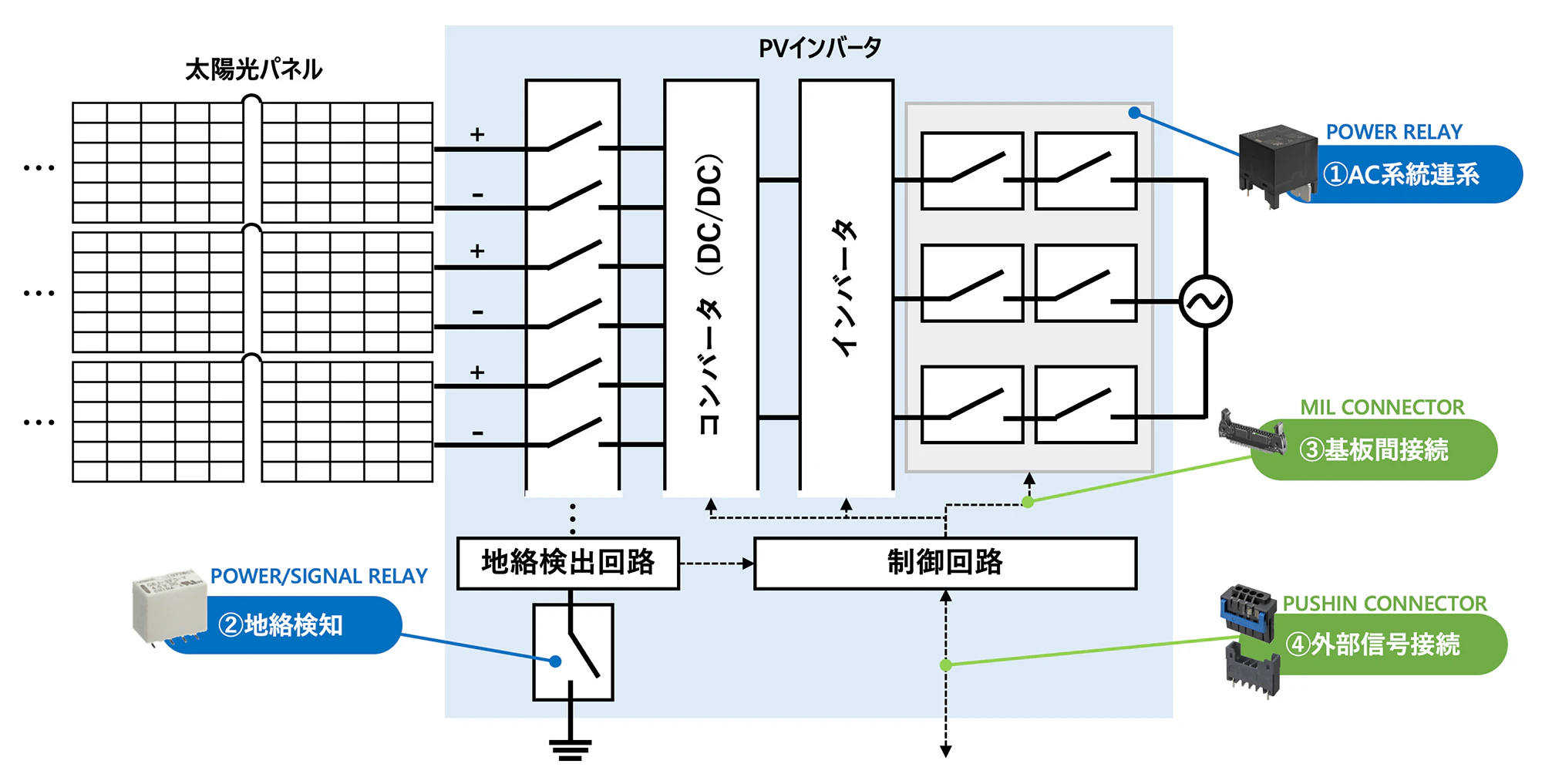 太陽光発電向けアプリケーションに推奨するオムロンの電子部品 (リレー、スイッチ、 コネクタ、 センサ) を紹介いたします。