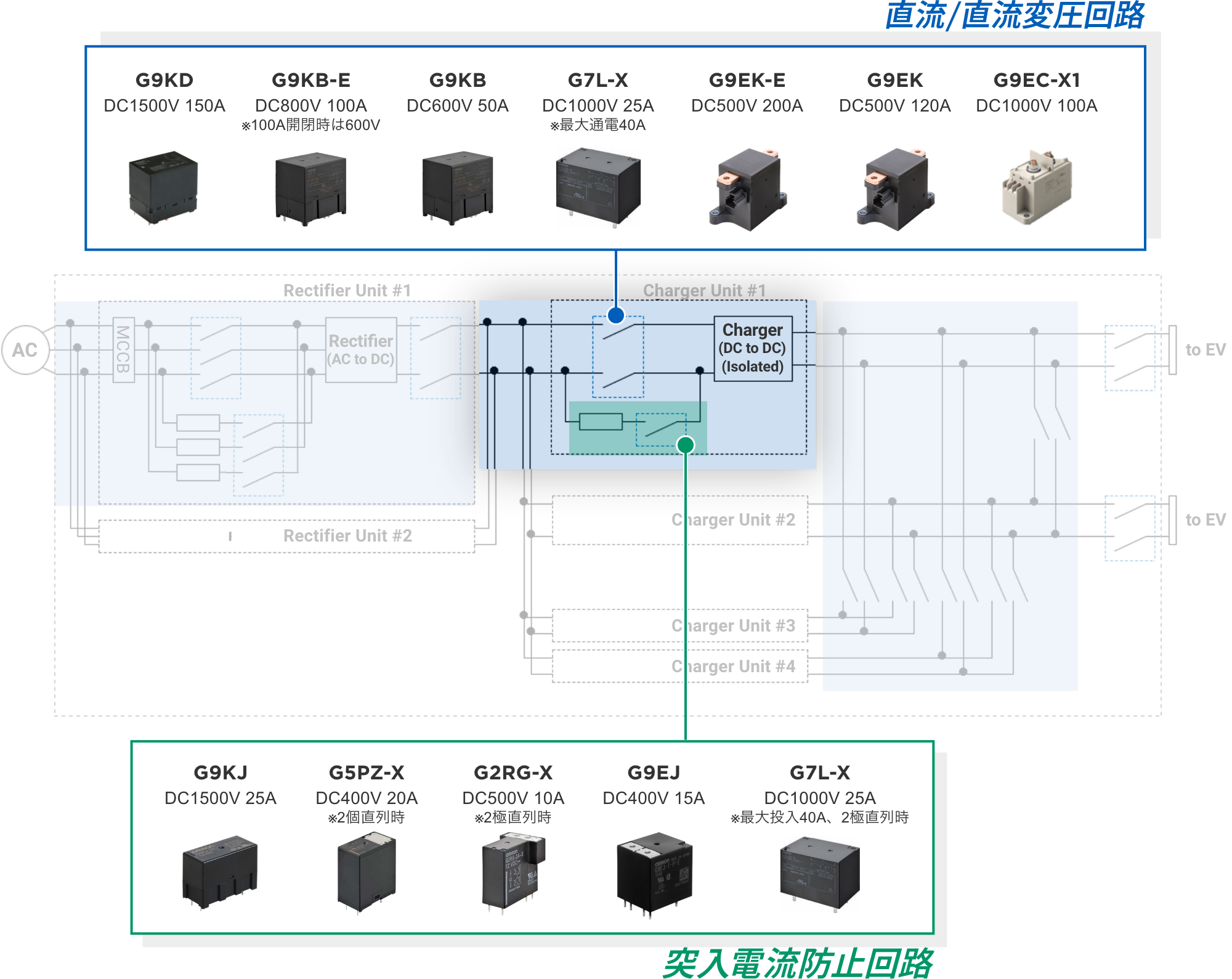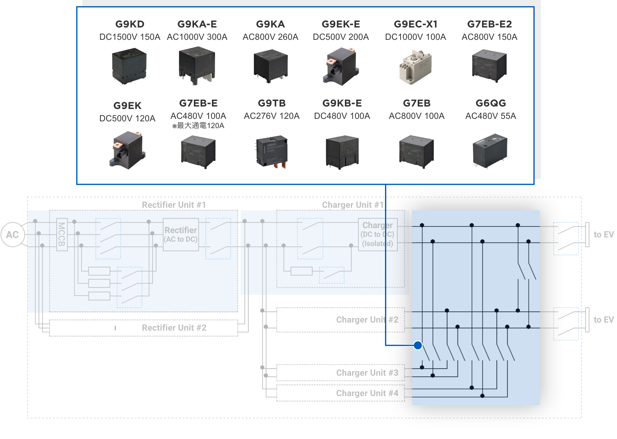 比較的シンプルな構造のMode 3に比べて、変換器を含む複雑な構造のMode 4には、各部位によって求められるリレーの仕様も数も異なります。このランディングページでは、急速充電器回路の各部位ごとの特長と、それらに適したリレーについて説明します。
