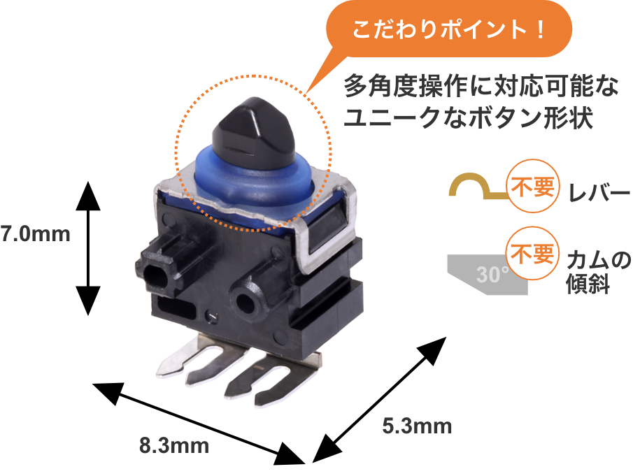 押しボタンは通常、真上から押下されるように設計されています。レバーなしで水平カムで操作するためには、カムのスイッチ操作部に角度をつけることが必要となりますが、その角度は、約30度が限界です(機種によります)。角度が大きくなるほど、押しボタン部に負担がかかり、スイッチとしての寿命は短くなってしまいます。