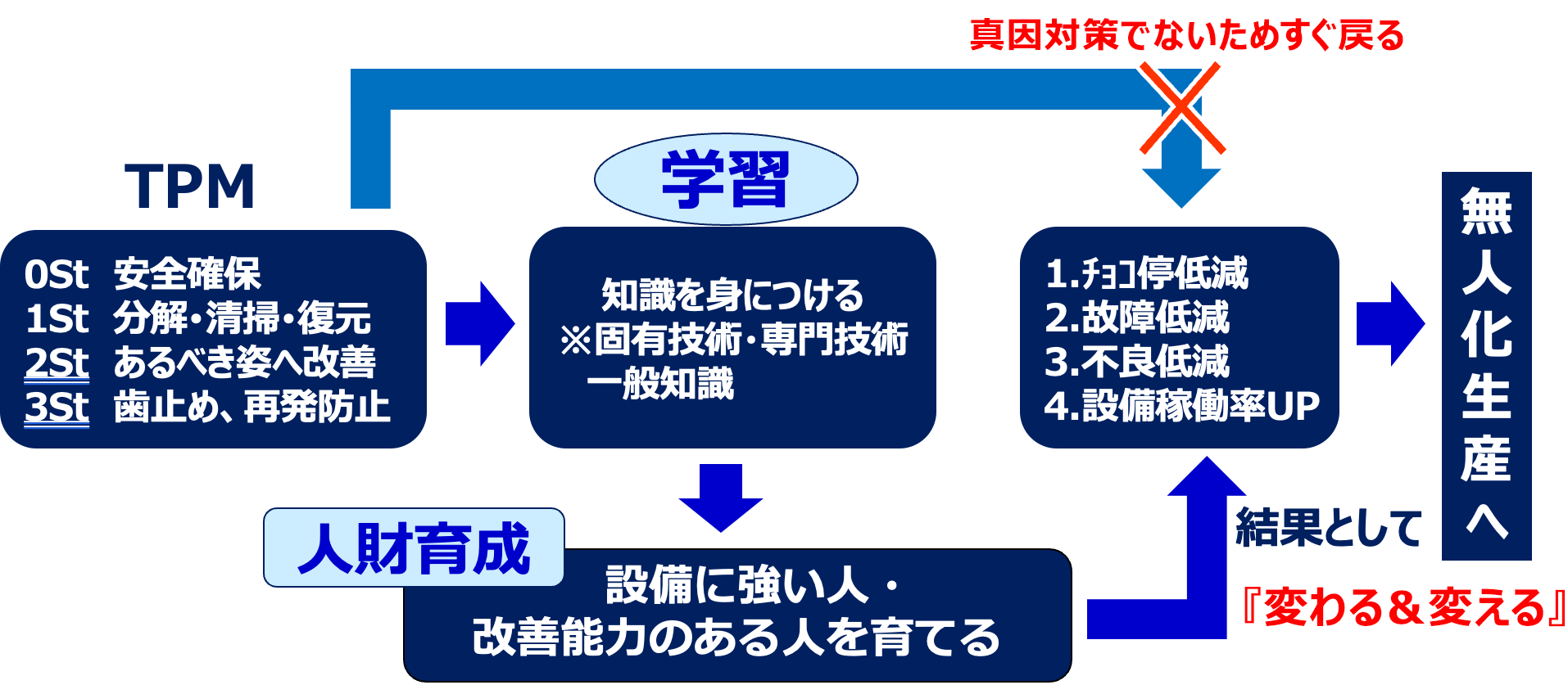 - TPMは設備に強い人財を育成する活動である ※異常を発見し改善できる能力を備えた人財を育てる