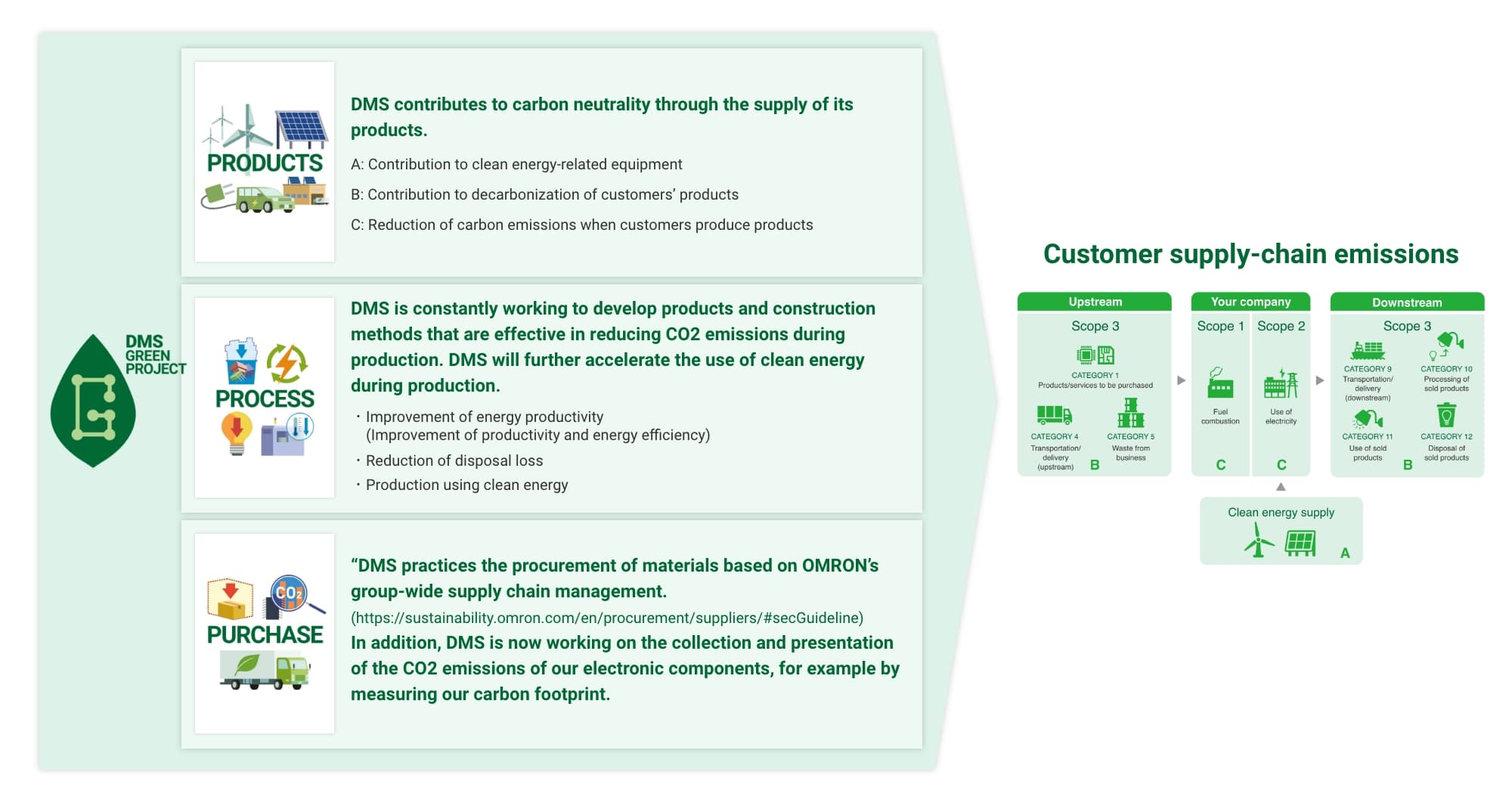 Overall view of the DMS GREEN PROJECT. OMRON Device & Module Solutions Company, which itself plays a part in the supply chain, contributes to the achievement of carbon zero on a global scale. [Click to enlarge] Provided by OMRON