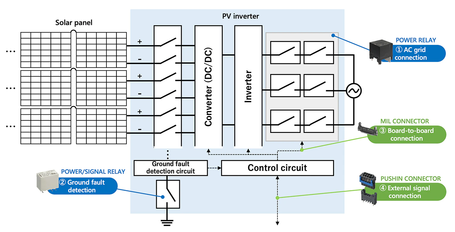 This article introduces OMRON's electronic components (relays, switches, connectors, and sensors) recommended for solar power generation applications.