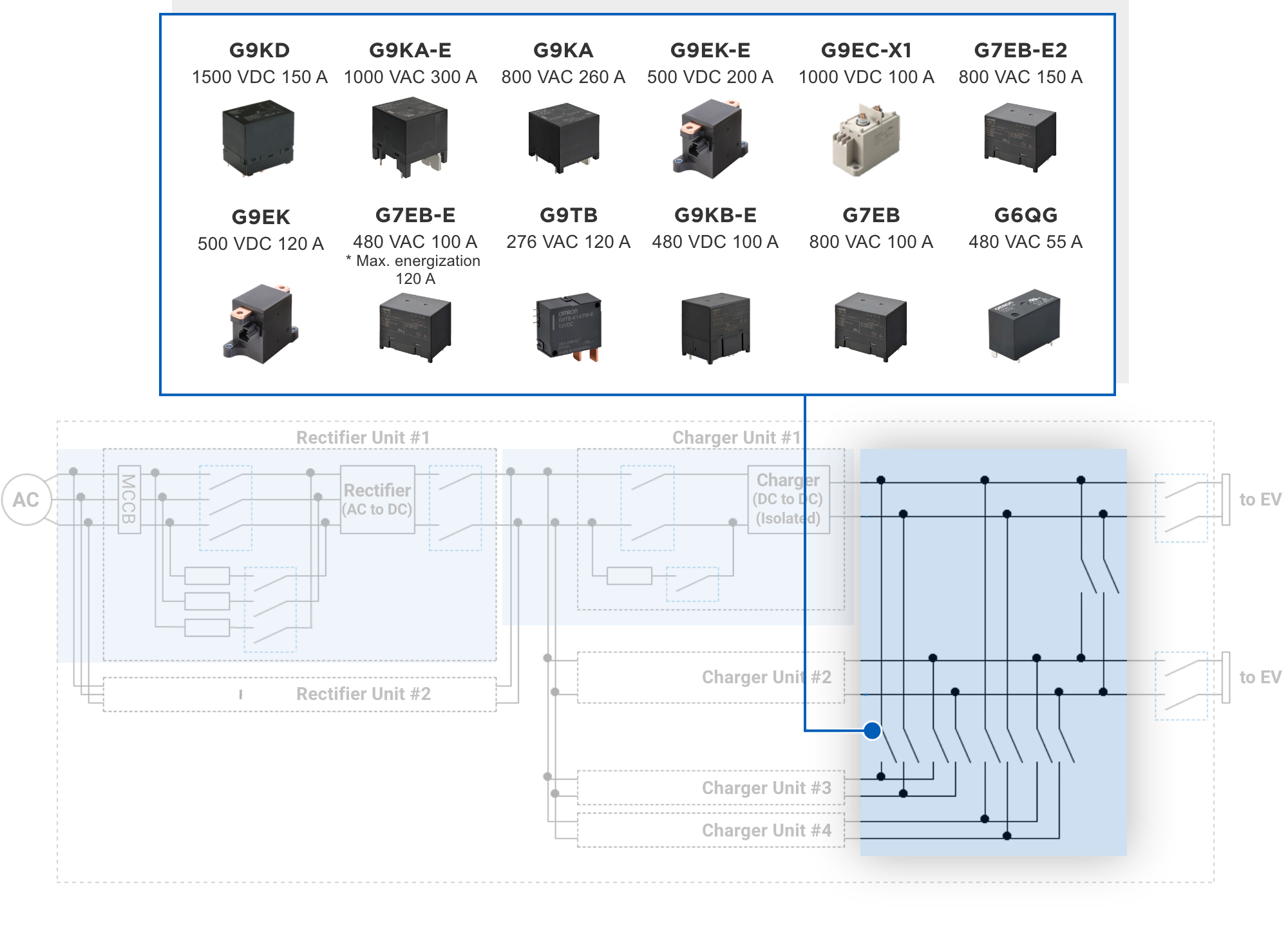 Compared to Mode 3, which has a relatively simple structure, Mode 4, which has a complex structure including transducers, requires different specifications and number of relays for each part. This landing page describes the features of each part of the fast charger circuits and the relays suitable for them.
