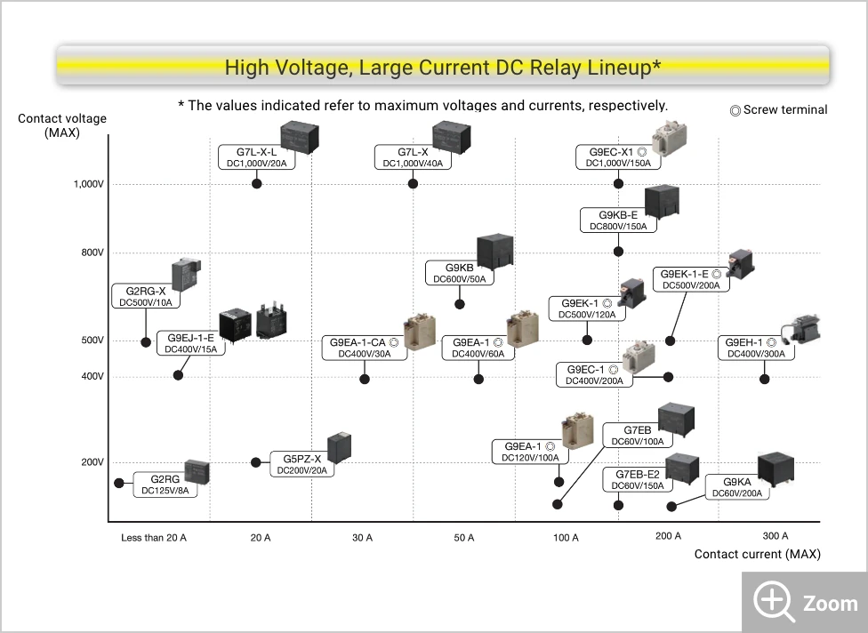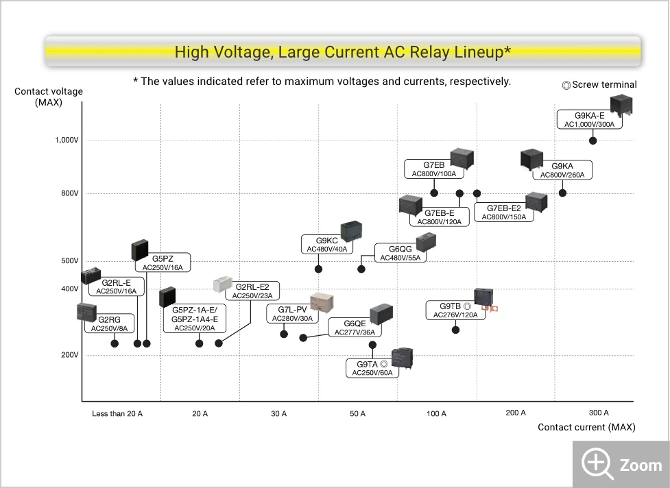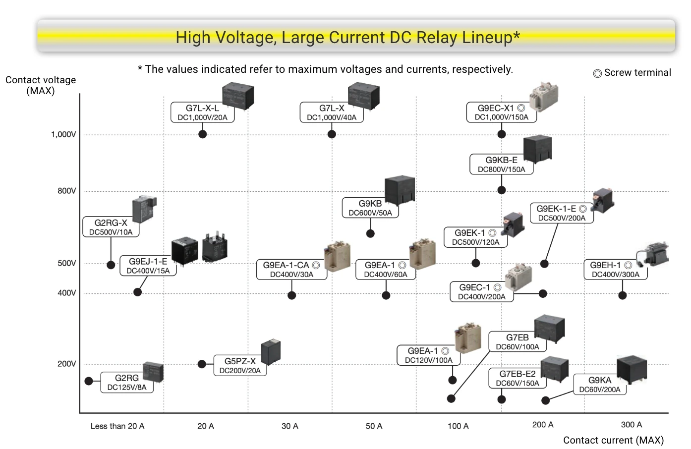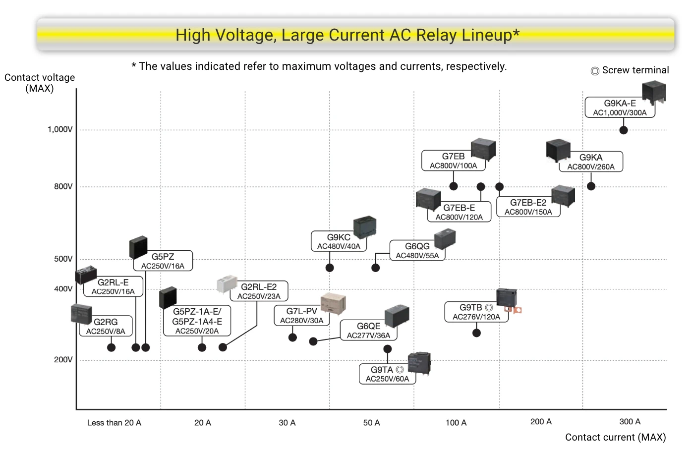 As a result, some of the area bands that were conventionally controlled by contactors can now also be controlled by PCB relays. For example, OMRON’s PCB relays can cover current and voltage ranges up to 1000 VAC/VDC and 300 A.