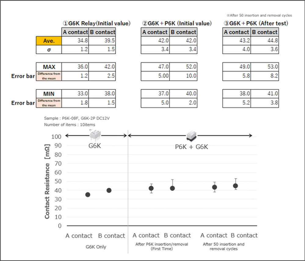 ②Relay (G6K-2P) + Socket (P6K-08F) combination after 50 insertions/removals (durability test)
