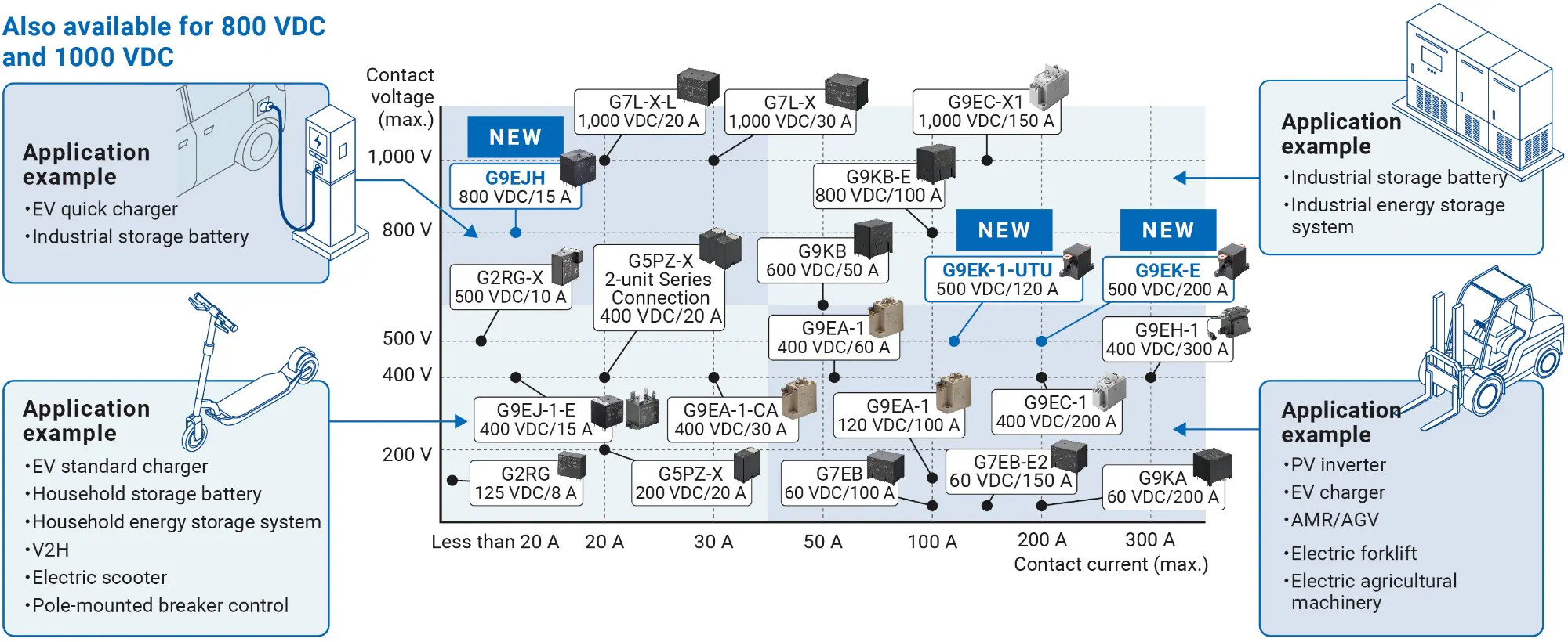OMRON offers a wide range of DC switching relays compatible with various devices, meeting the demand for higher capacities and voltages while maintaining similar performance in voltage, current, size, and mounting method.