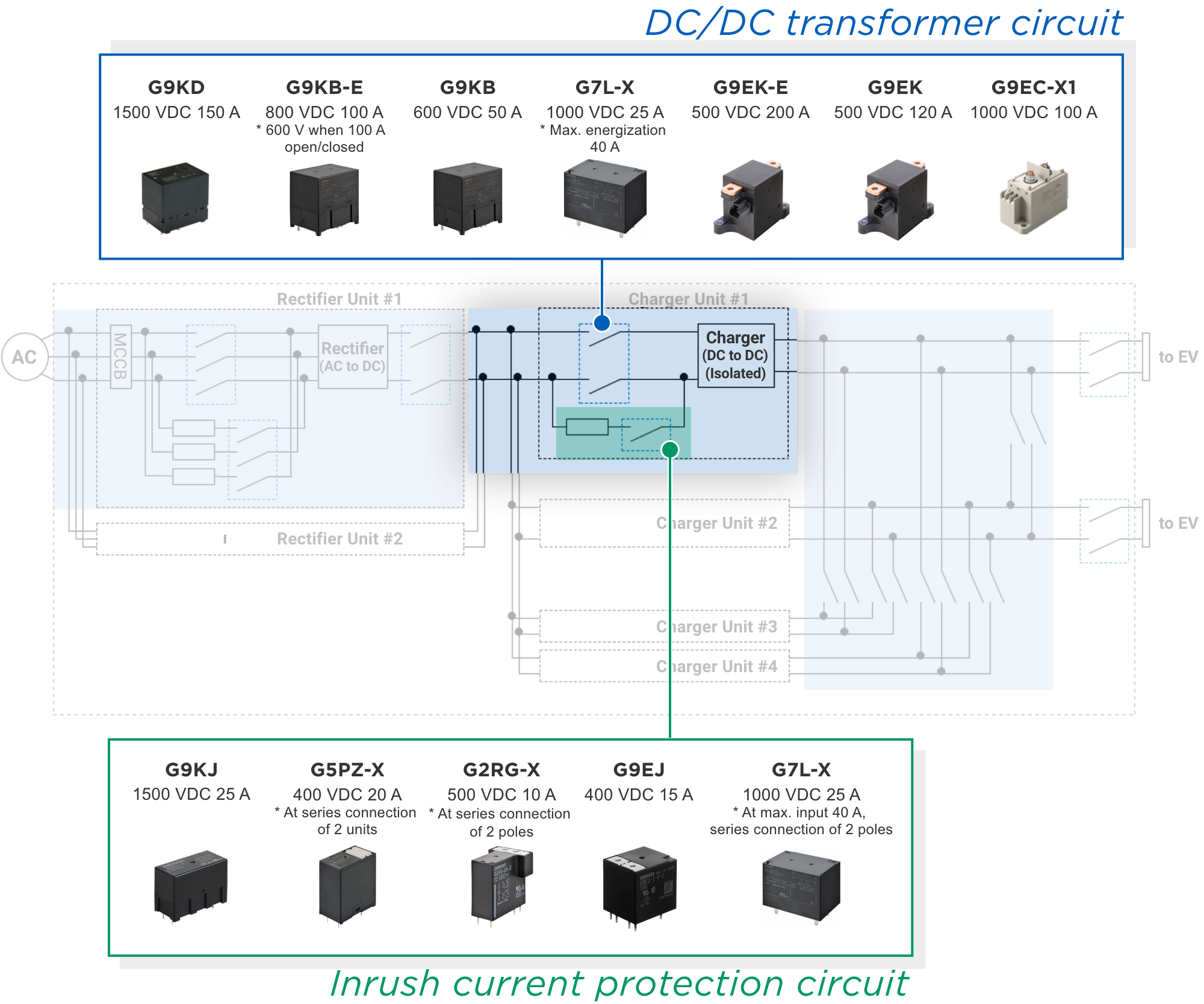 Switching devices may be used in the DC/DC transformer circuit to ensure safety in the event of a malfunction in the charge control circuit. As EV batteries adopt higher voltage, relays capable of switching high voltages (up to 1500 VDC) are required. In addition, to increase charger redundancy, multiple DC/DC transformer circuits are often configured in parallel. Each transformer circuit requires the installation of a relay in the same manner as above.