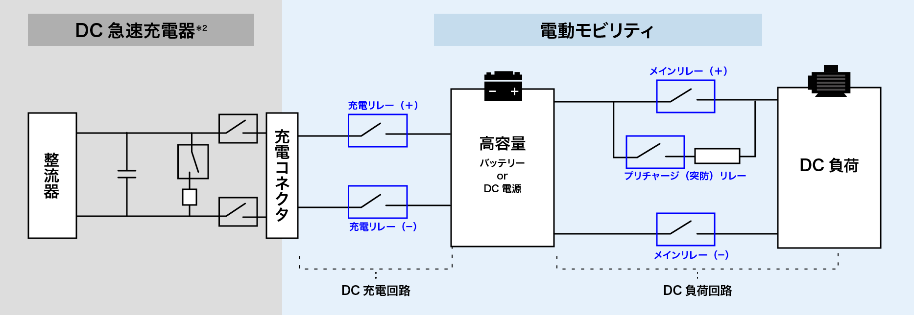 電動モビリティは、大きく分けて充電装置、バッテリー(DC電源)、DC負荷の3つの要素があります。その中でDCリレーは遮断用途とプリチャージ用途の2つの役割が求められます。安全性が強く求められるアプリケーションです。