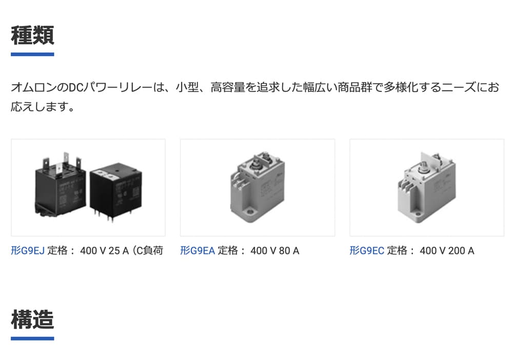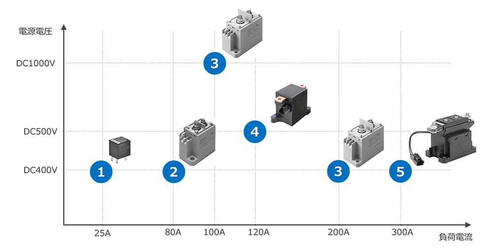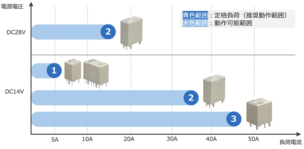 (参考)オムロンの高容量DCリレー主要ラインアップ(定格負荷別)