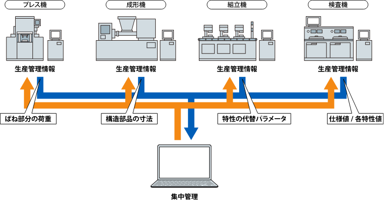 さらに、部品工程の操作感触を決めるバネ部品工程に特性検査機を導入し、部品生産後に部品単体での荷重を測定しています。オムロンが規定する中心値から”0.01mm”の変化が発生した際に、金型の調整機構が自動でフィードバック制御を行い、中心値に修正する工程も入っており、操作感触の均一化のキーポイントとなっています。