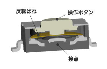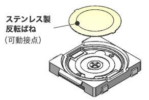 反転ばね(可動接点)は、金属製の円板状の部品です。力を加えると反転し、可動接点と固定接点が接触することで、オン状態になります。