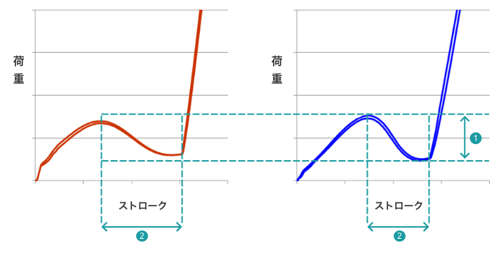 ①最大荷重からの落ち込み荷重:大きいほど操作感触が大きい。