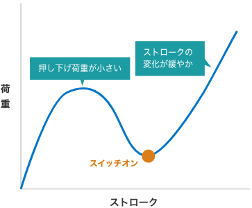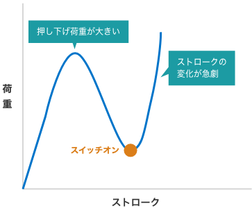 大きな荷重をかけないと押し込めないため、誤入力が防止できる。荷重とストロークの変化が急激で、しっかりとしたクリック感 |