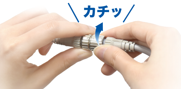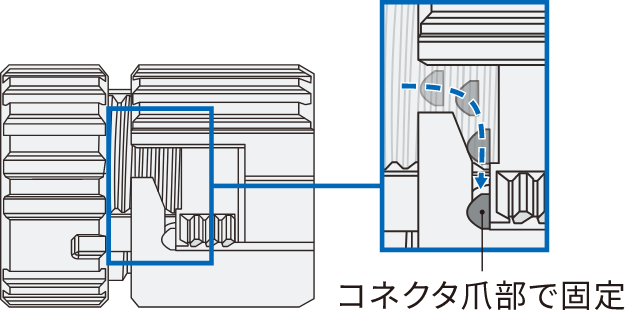 通信機器などで幅広く採用されているバイヨネット機構をコネクタの構造に組み込んでいます。コネクタ内部にある爪部分が引っかかることで1/8回転でロックがかかり、嵌合部分の緩みに対する不安を取り除きます。