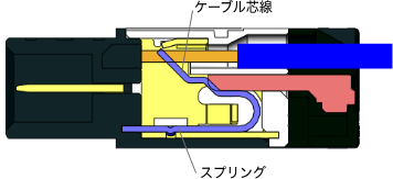 スプリング(バネ)の力でケーブルを押さえつけることで、接圧でケーブルを結線するスプリングクランプ方式という構造を採用しています。ケーブルを押さえつけているだけなので、何度でも繰り返し結線のやり直しが可能です。