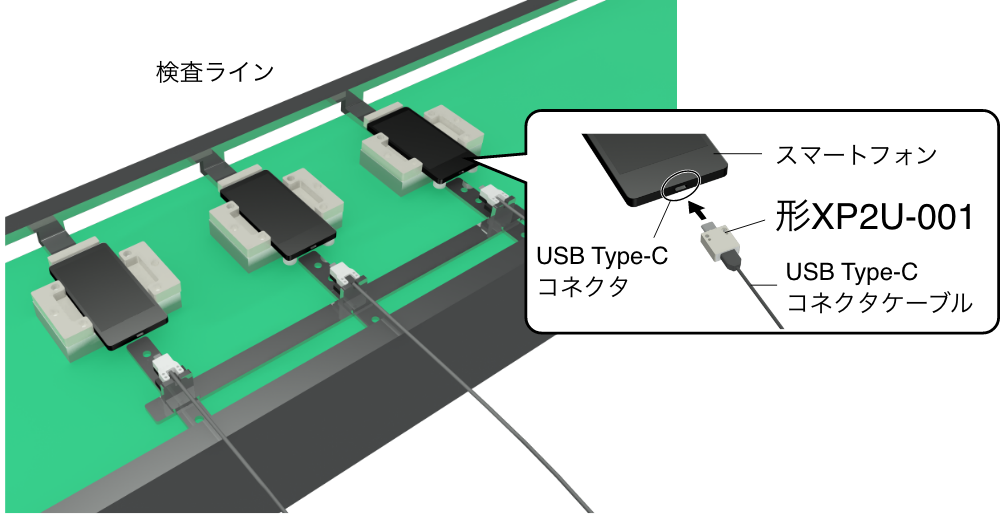 例えばUSB Type-Cで充電するタイプのスマートフォンの製造工程では、必ず導通検査が行われます。1日に数万から数十万回もの挿抜が必要なスマートフォンの導通検査において、ロック機構がなく、軽い力でスムーズに抜き挿しできるオムロンの形XP2U-001なら、製品をしっかりとホールドする必要もなく、製品を傷つけるリスクも軽減することができます。