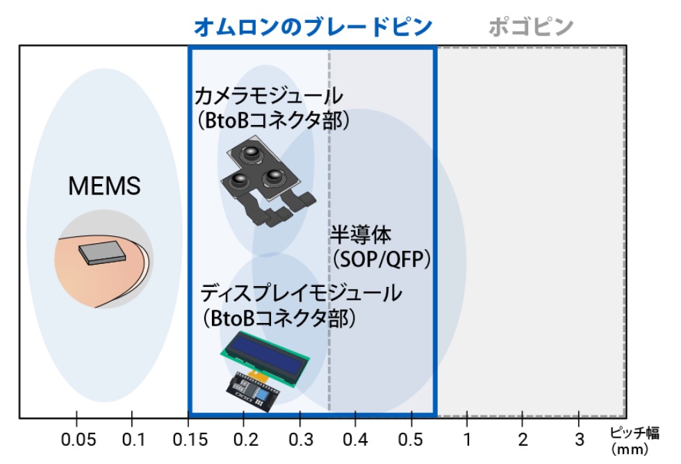 オムロンは、ポゴピンでは困難な0.35mm以下のピッチ幅に対応可能な検査用ピンの提供が可能です。最小0.175mmまでの狭ピッチに対応可能で、高密度実装による多機能化が進むカメラモジュールやディスプレイモジュールでも、精度の高い検査を実施いただけます。お気軽にご相談ください。