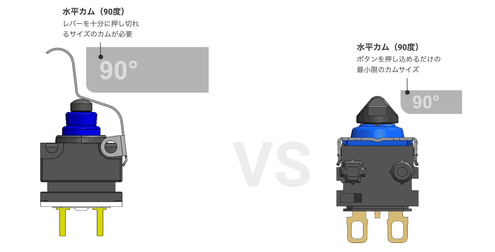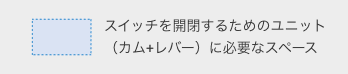 90°カムでも操作可能なため、カムの移動距離を圧倒的に短縮。レバーなしの同等サイズのスイッチと比較しても超省スペース
