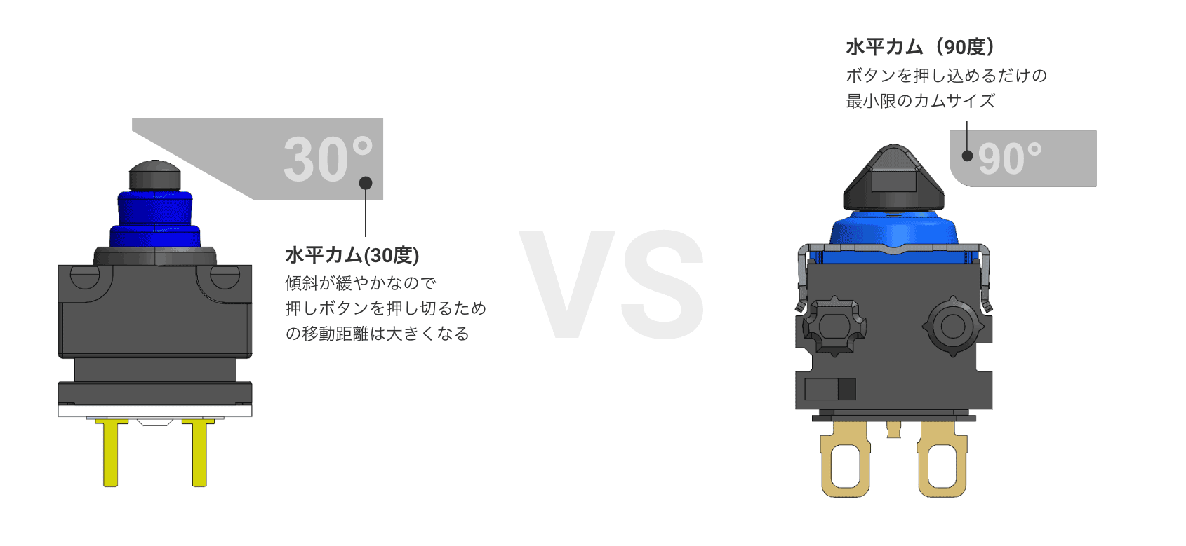 押しボタンは通常、真上から押下されるように設計されています。レバーなしで水平カムで操作するためには、カムのスイッチ操作部に角度をつけることが必要となりますが、その角度は、約30度が限界です(機種によります)。角度が大きくなるほど、押しボタン部に負担がかかり、スイッチとしての寿命は短くなってしまいます。