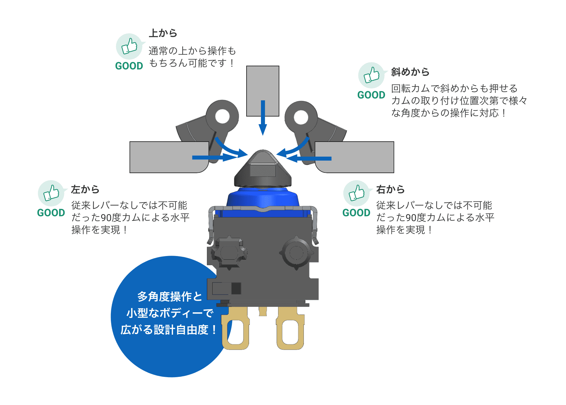 形D2EWは、オムロンが新たに考案したユニークな押しボタン形状により、レバーなしで、しかも水平カムに傾斜を設けることなく、水平方向からの操作に対応することが可能です。また、水平方向だけでなく、その他の角度からの操作にも対応できます。(下図参照)