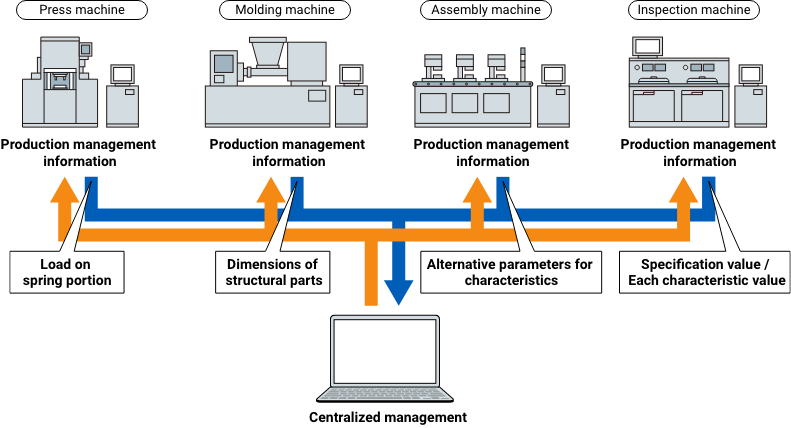 We have introduced an integrated production system from parts processing to product inspection. We have also introduced a characteristic inspection machine in the spring parts process, which determines the operation feel of the parts process, and measures the load on individual parts after they are produced. When there is a change of "0.01mm" from the center value specified by OMRON, the adjustment mechanism of the mold automatically performs feedback control and corrects the center value, which is a key point in achieving uniformity in the operation feel.