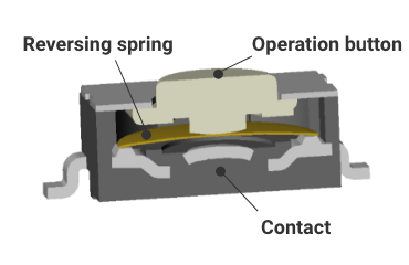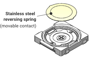 The reversing spring (movable contact) is a metal disc-shaped part. When force is applied, this spring reverses and the movable and fixed contacts come into contact, resulting in the ON state.