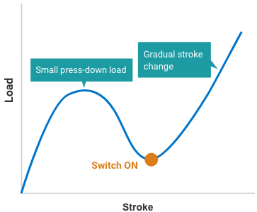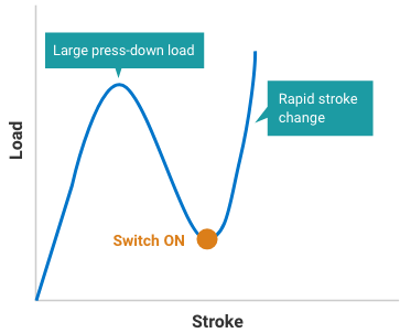 This switch can only be pressed in with a large load applied, thus preventing erroneous input. The rapid change in load and stroke gives a solid clicking feel. |