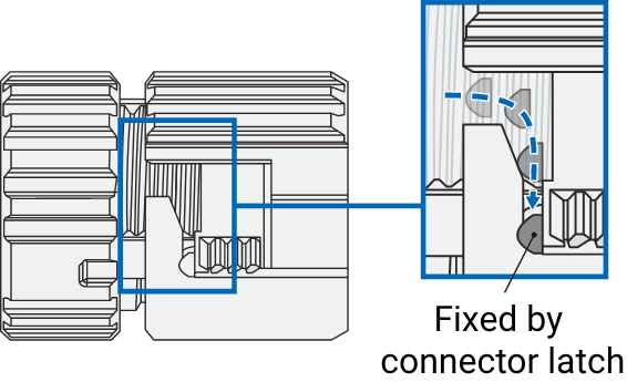 The bayonet mechanism, which is widely used in telecommunications equipment, is incorporated into the connector structure. A latch inside the connector is hooked to lock the connector at 1/8 turn, eliminating concerns about loosening of the mating part.