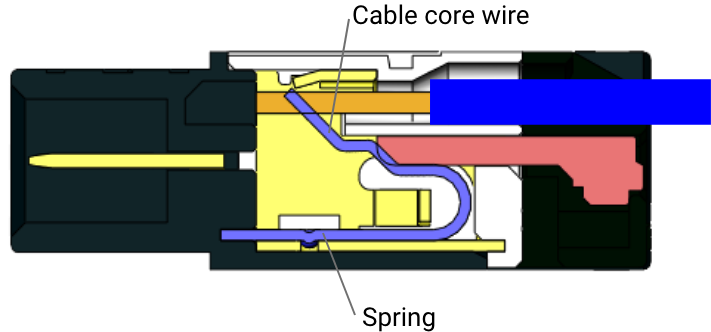 A structure called a spring clamp method is used to tie the cable through contact pressure by holding down the cable with the force of a spring. Since the cable is only held down, the wiring can be redone repeatedly as many times as necessary.