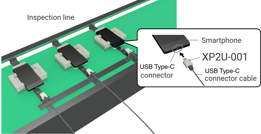 For example, in the manufacturing process of smartphones that charge via USB Type-C, a continuity test is always performed. In the continuity testing of smartphones, which requires plugging and unplugging tens or hundreds of thousands of times a day, OMRON's XP2U-001 has no locking mechanism and can be smoothly plugged and unplugged with light force, eliminating the need to hold the product firmly and reducing the risk of damage to the product.