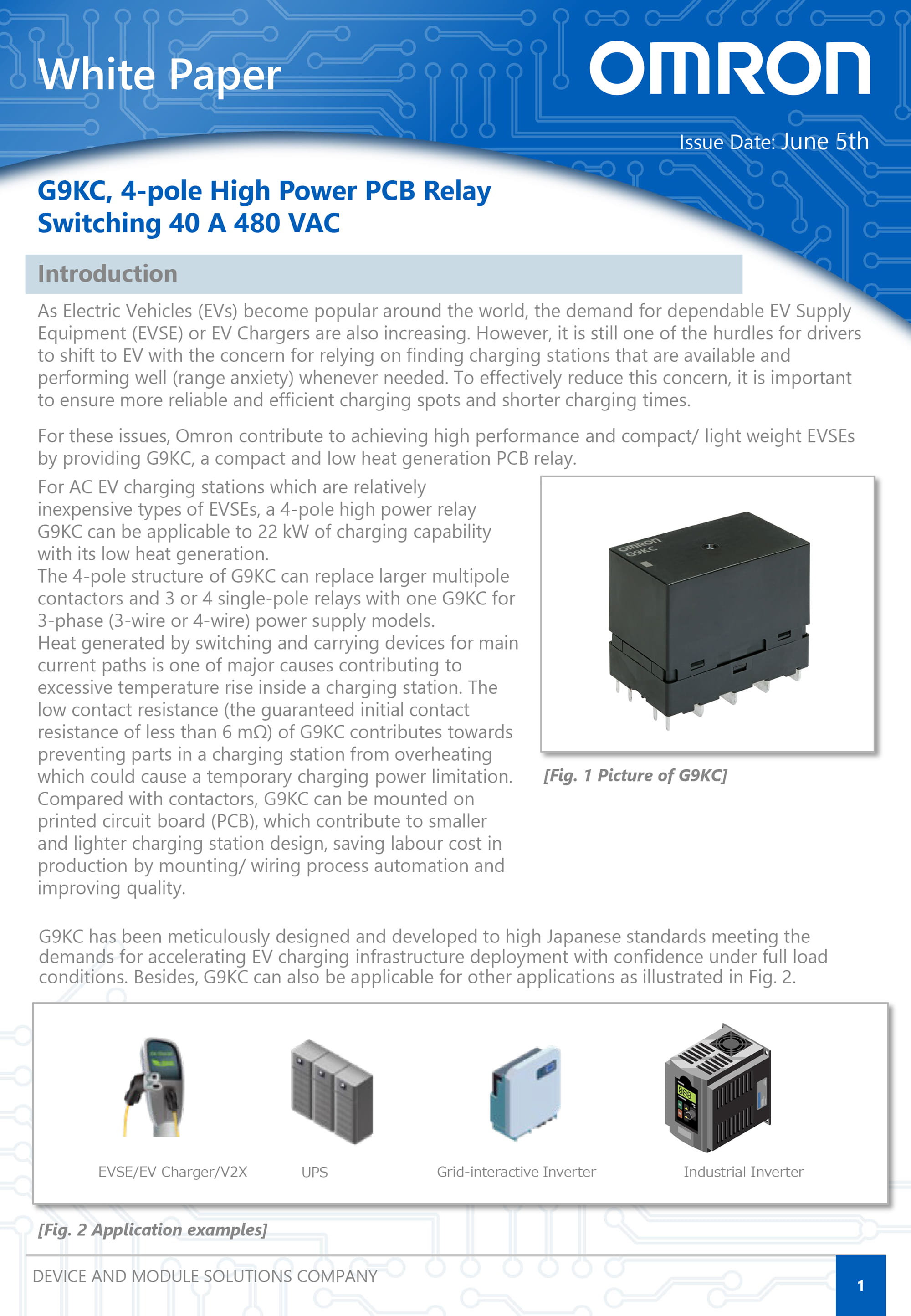 The power relay G9KC can be used for input/output switching of various devices as well as AC EV chargers.