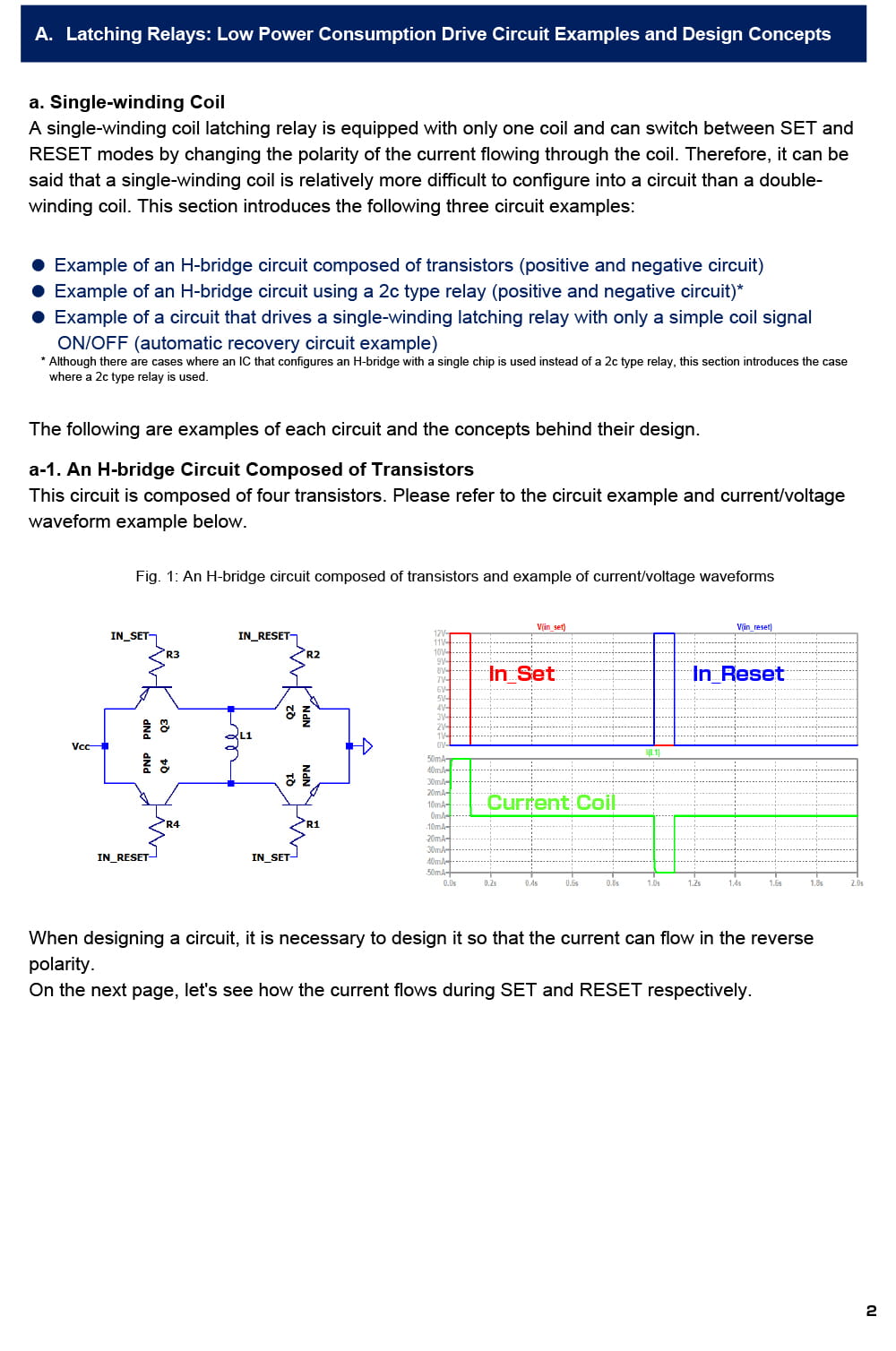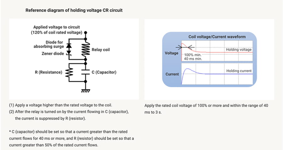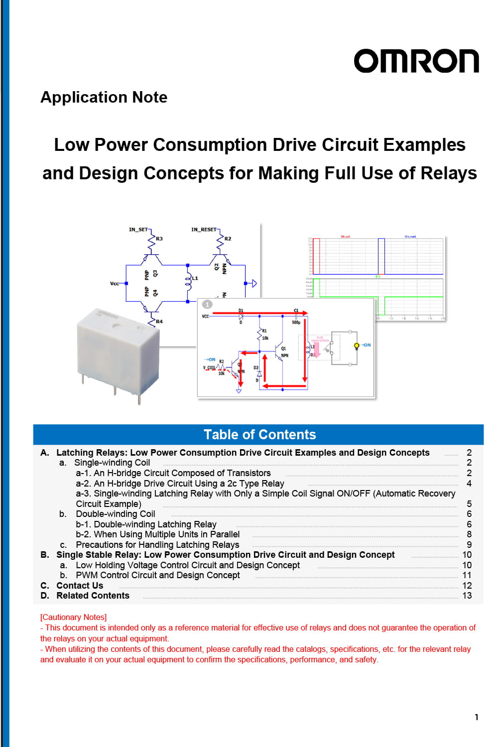 Compared to semiconductor components, mechanical relays tend to consume more power, but by devising circuit control, it is possible to design them with lower power consumption. Please refer to the following documents for design reference for examples and concepts of low power consumption drive circuits for latching relays (single- and double-winding coil) and single-stable relays.