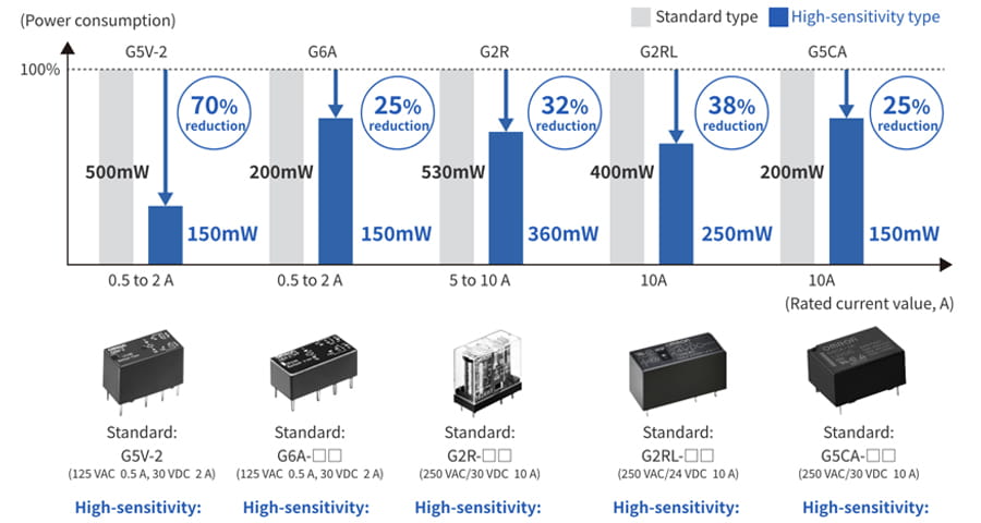 Latching function is newly incorporated into the long-selling G5Q series. A latching relay can maintain the contact (output) ON state with only one pulse of current and achieve a significant reduction in power consumption. By reducing the drive power, the heat generated by the component itself can also be reduced.